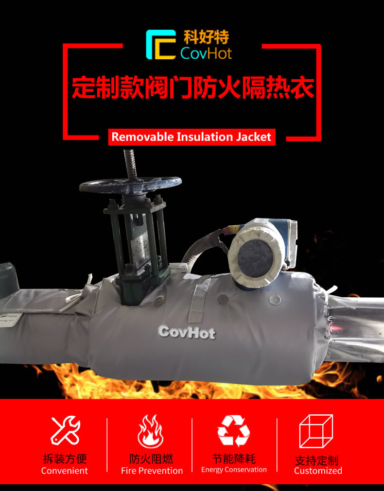CovHot可拆卸閥門保溫套耐高低溫,防火阻燃,使用壽命長,應(yīng)用范圍非常廣泛,可應(yīng)用于塑料機械、石油化工、冶金電力、食品建筑、鐵路船舶等領(lǐng)域的設(shè)備和閥門管路。