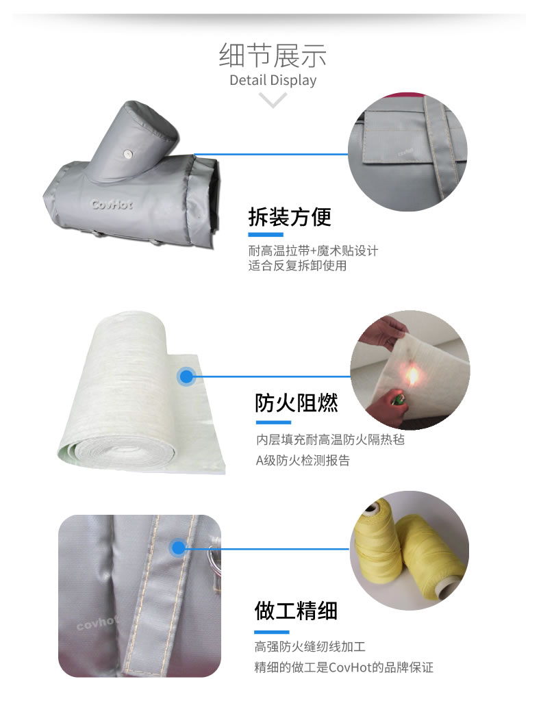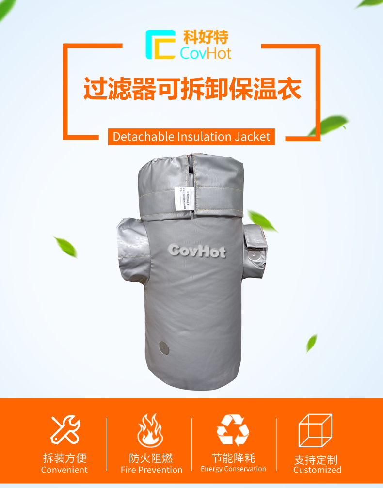 過濾器保溫是保溫工作的+薄弱環(huán)節(jié),雖然過濾器所占面積不大,但如果保溫效果不好的話,其散熱損失不可低估。河北科好特柔性可拆卸過濾器保溫套,采用玻璃纖維復(fù)合涂層材料做表層,內(nèi)填充玻璃纖維、陶瓷纖維、納米纖維等材料,通耐高溫線制作而成??梢匀〈蟛糠謧鹘y(tǒng)保溫隔熱,效果好,拆裝方便,可多次重復(fù)使。無需專業(yè)保溫人員,無需專業(yè)培訓,操作簡單快速,表層纖維布不含石棉成分,防油、防水性能優(yōu)良,無纖維飛散問題。耐高溫可達1000℃以上。